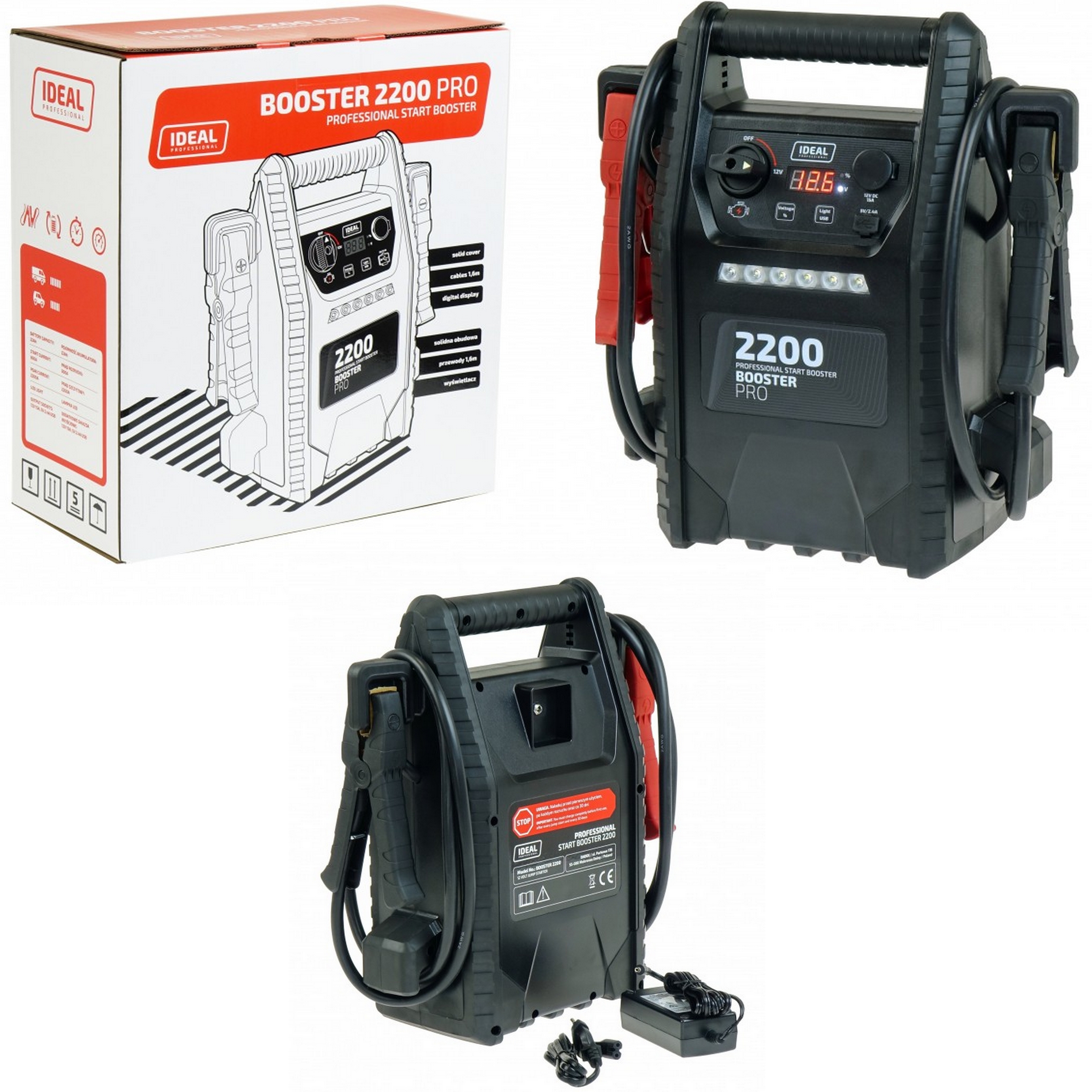 BOOSTER 2200 PRO jest przenośnym akumulatorem do wspomagania rozruchu samochodów osobowych, dostawczych oraz (silniki: benzynowe, diesla) 12V