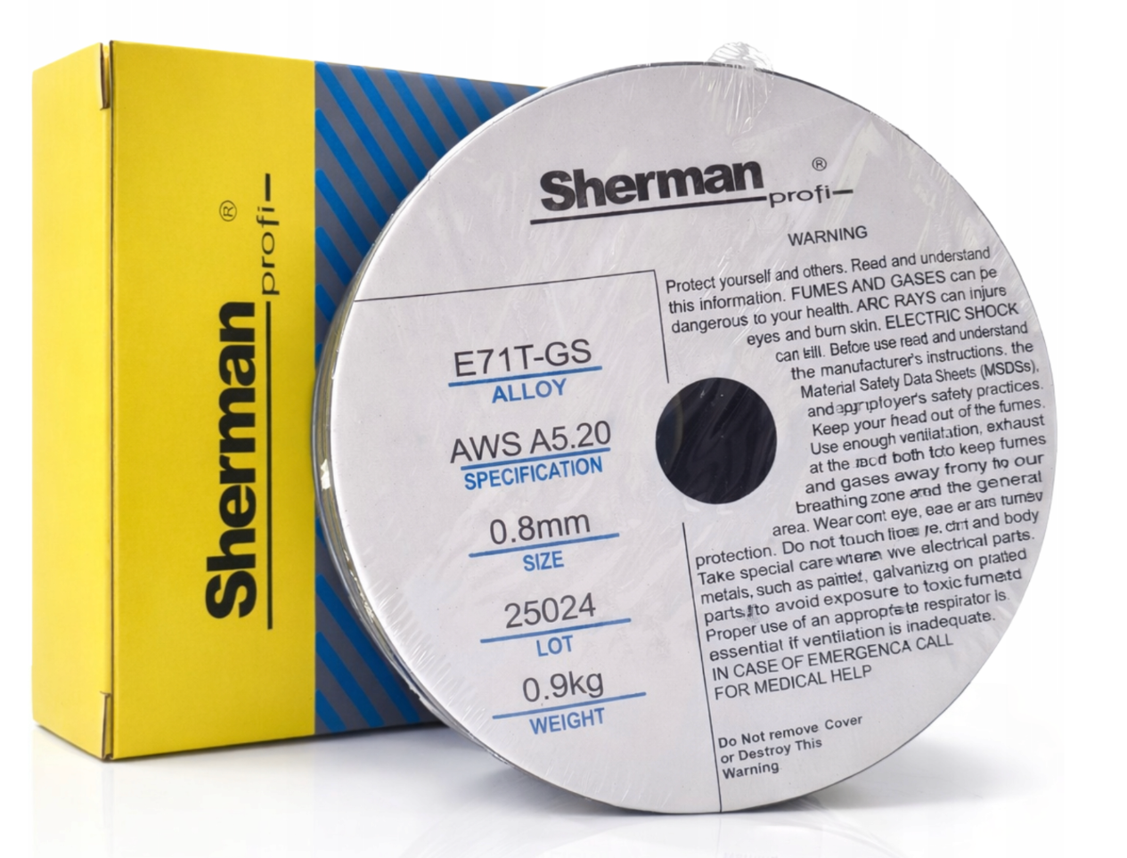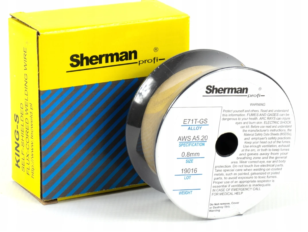 Drut proszkowy samoosłonowy 0,8mm 0.9KG KING-S E71T-GS marki Sherman przeznaczony jest do spawania bez osłony gazowej stali węglowych zwykłej i podwyższonej wytrzymałości nieprzekraczającej 540 MPa. Znajduje zastosowanie w prefabrykacji, budownictwie, produkcji zbiorników, sprzętu rolniczego itp.