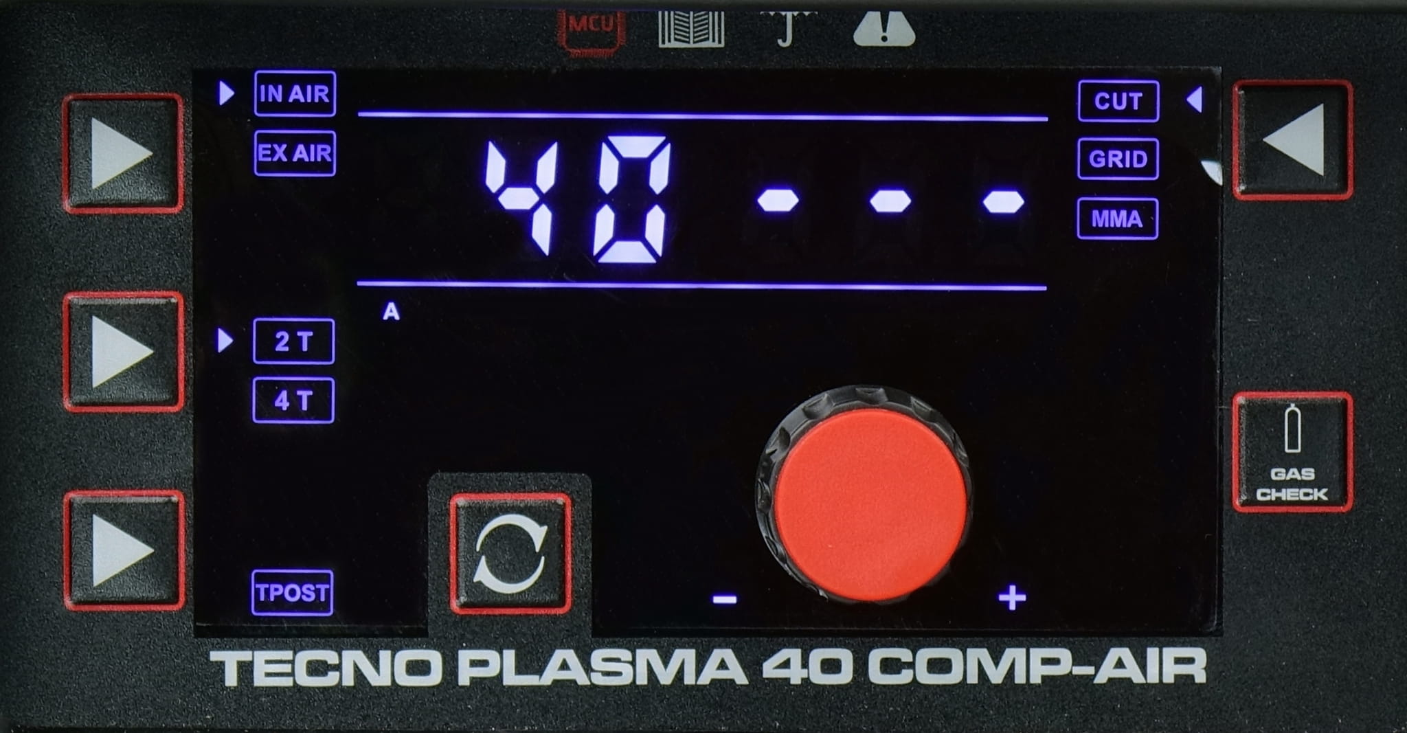 - 2T - czyli tzw. dwutakt, to tryb pracy w którym proces cięcia plazmowego prowadzony jest wtedy, kiedy trzymamy wciśnięty przycisk na uchwycie,