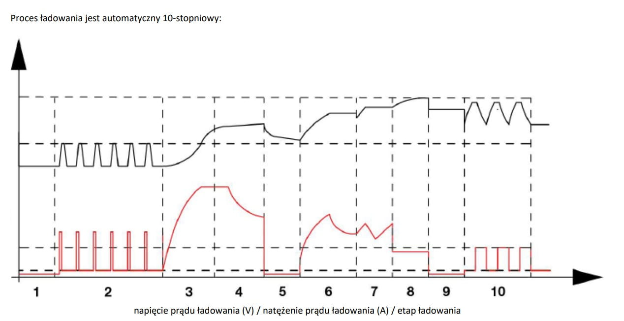 ETAP 10: KONSERWACJA: monitorowanie napięcia akumulatora i utrzymywanie optymalnego naładowania na poziomie 95-100% pojemności poprzez impulsy prądu ładowania w przypadku rozpoznania obniżenia podanej wartości