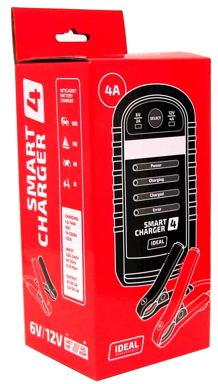 SMART CHARGER 4 jest elektronicznym prostownikiem do ładowania 6 i 12 woltowych akumulatorów kwasowych: