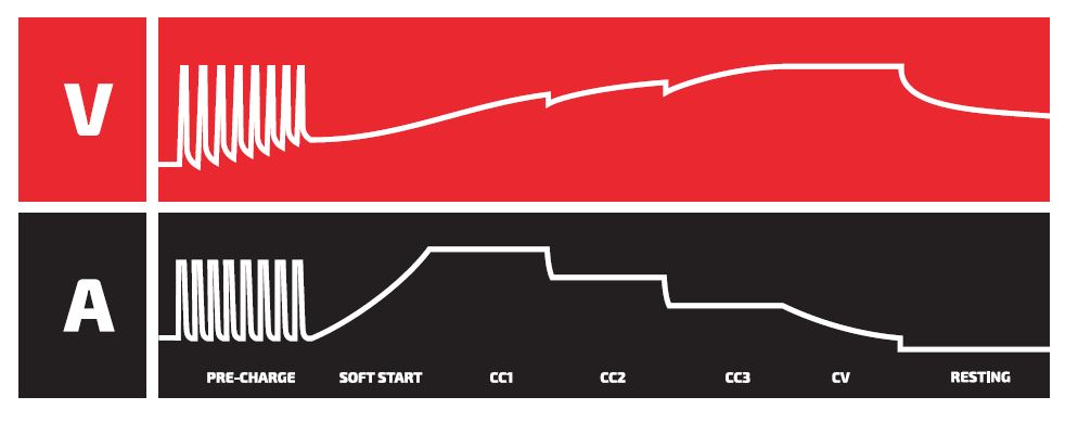 7-etapowy proces ładowania zapewnia uzyskanie optymalnych warunków ładowania akumulatora. Automatyczny układ sterowania dopasuje każdy z 7 etapów ładowania do poprawnego ładowania akumulatora: