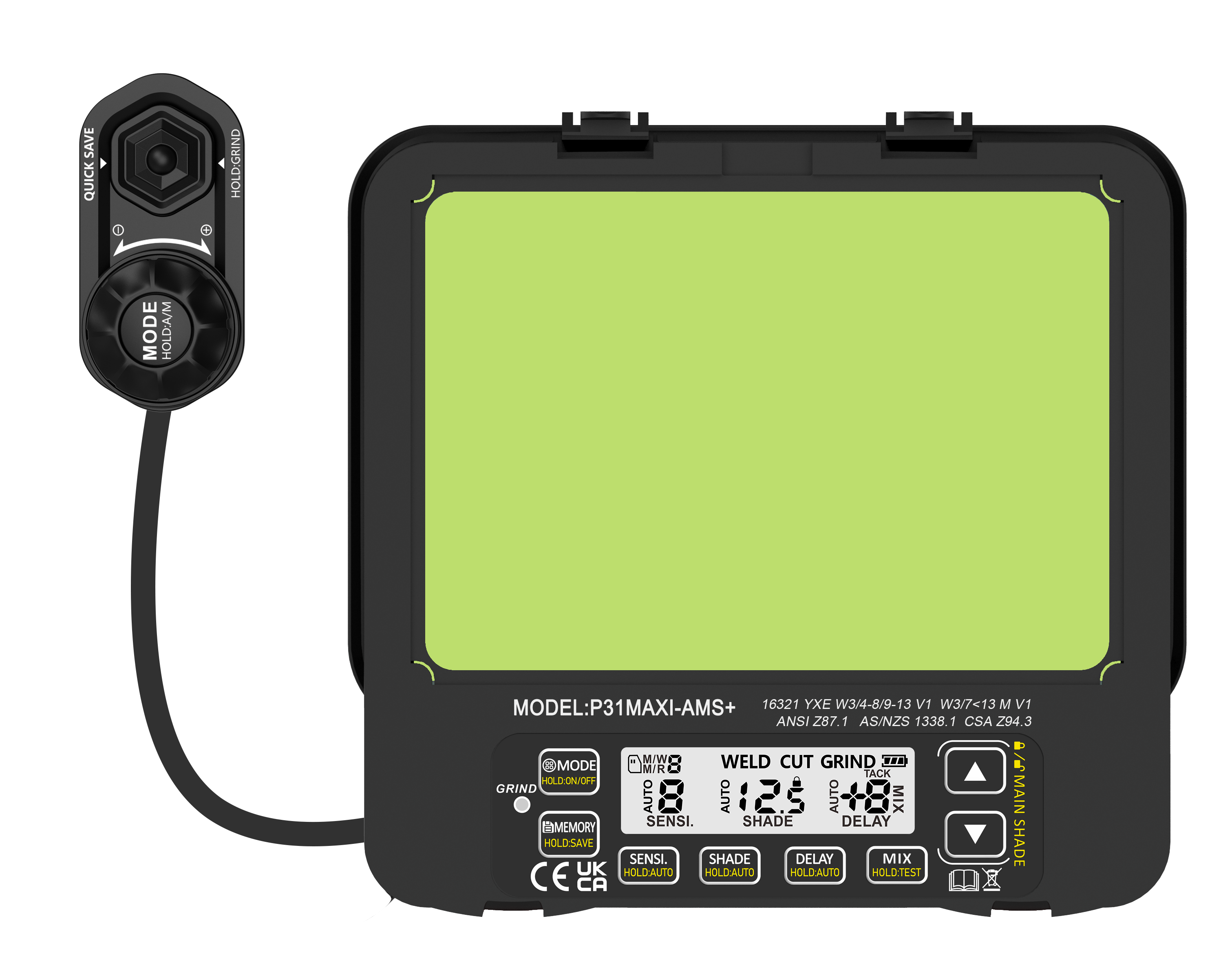 Przyłbica automatyczna APS Expert P31-MAXI-AMS+ X2 BLUE MAT TrueView+ ze zmiennym stopniem ochrony DIN 3 / 4-8 / 9-13, zmiennym czasem rozjaśniania, możliwością ustawienia wrażliwości czujników oraz trybem synergicznym (AUTO: SHADE, DELAY, SENSITIVITY)