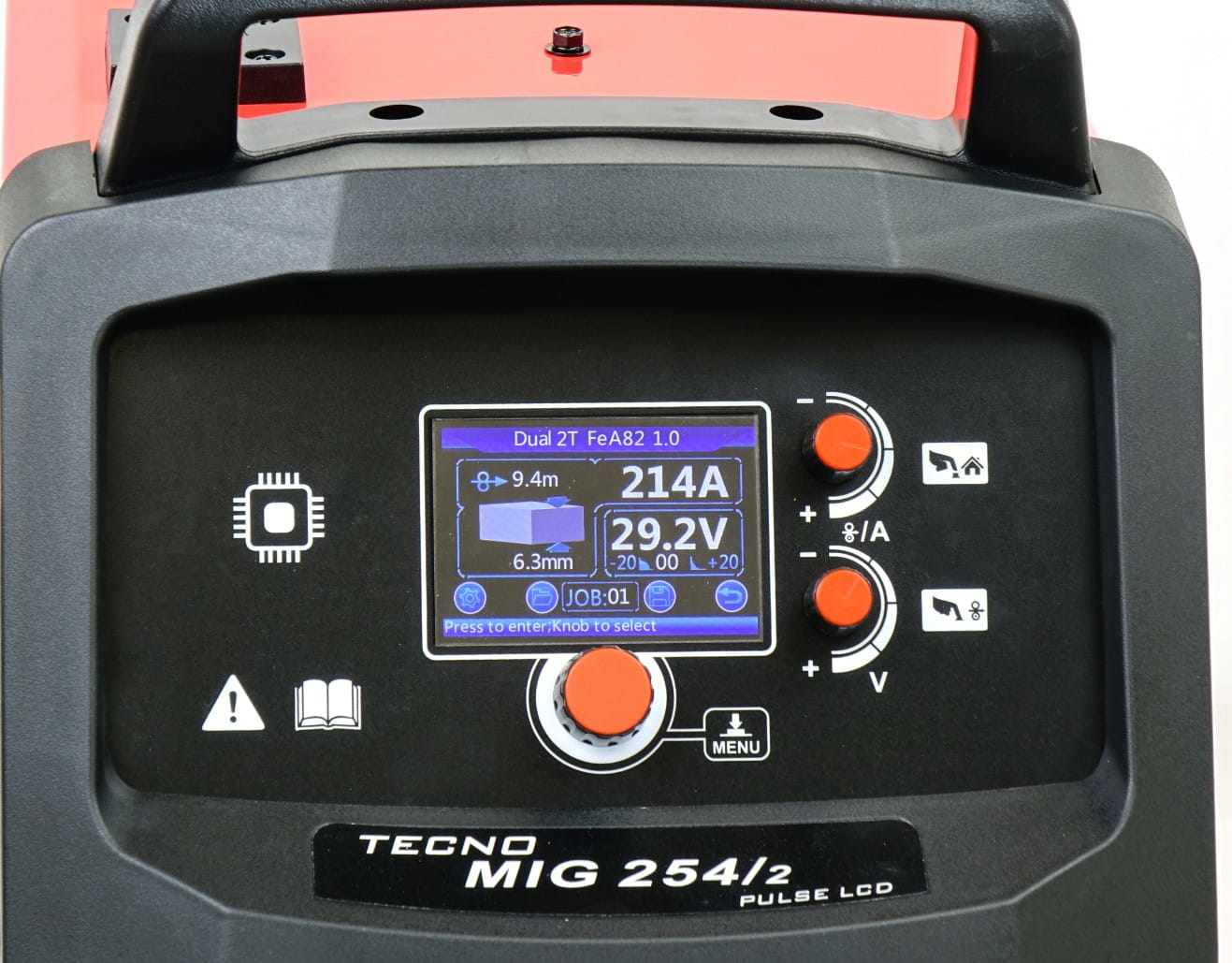 Czytelny i prosty w obsłudze wyświetlacz LCD umożliwia dokładną regulację parametrów spawania MIG takich jak :