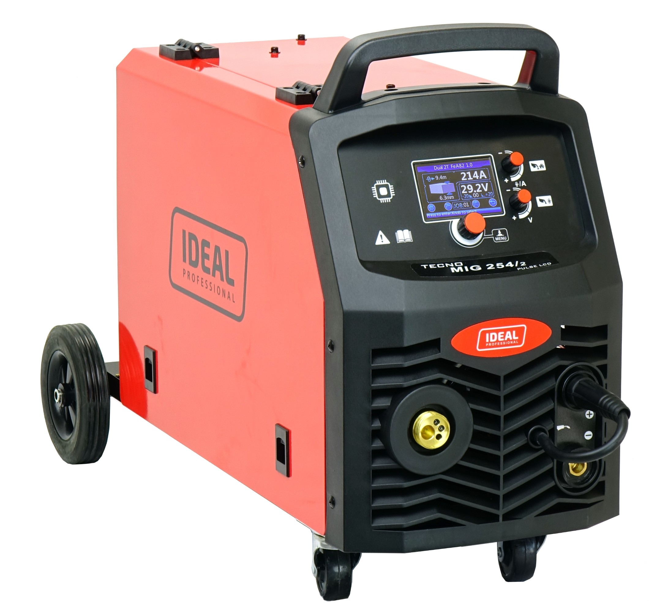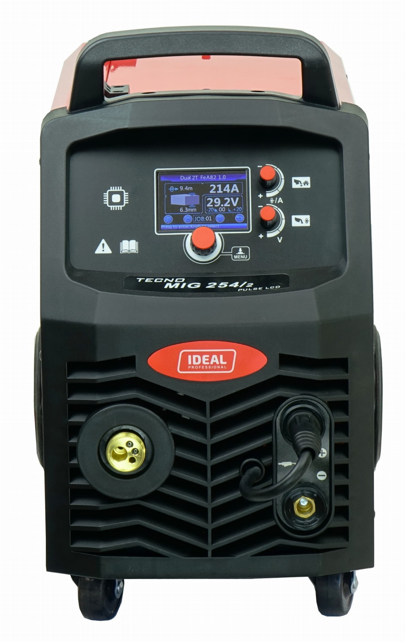 Czytelny i prosty w obsłudze wyświetlacz LCD umożliwia dokładną regulację parametrów spawania MIG takich jak :
