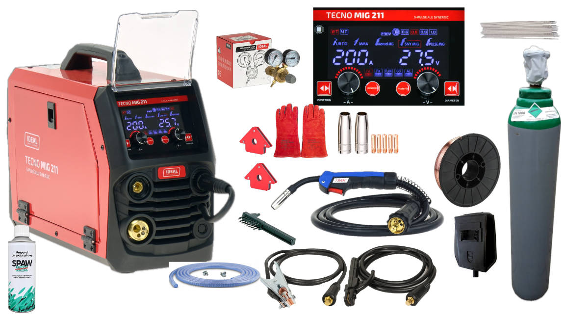 - Zakres regulacji prądu spawania: 30 - 200 A (MIG) / 15 - 200 A (TIG) / 20 - 180 A (MMA)