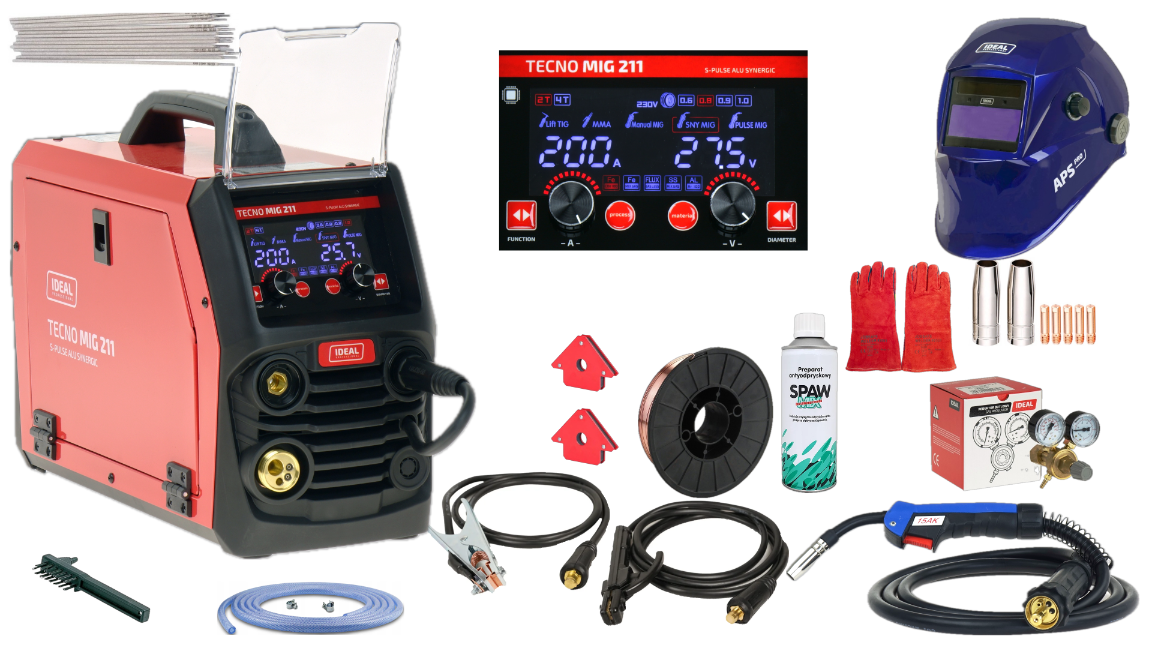 - Zakres regulacji prądu spawania: 30 - 200 A (MIG) / 15 - 200 A (TIG) / 20 - 180 A (MMA)