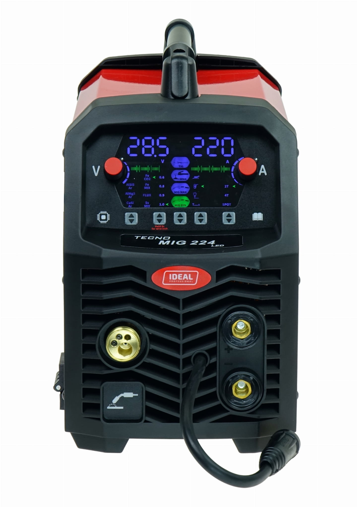 TECNOMIG 224 SYNERGIC LED 4x4 jest inwertorowym synergicznym półautomatem spawalniczym przeznaczonym do spawania łukowego metodą MIG/MAG, TIG LIFT, MMA oraz FLUX. Urządzenie zostało zaprojetowane do szerokiego zakresu zastosowań: od prac konserwacyjnych do napraw nadwozi samochodowych.