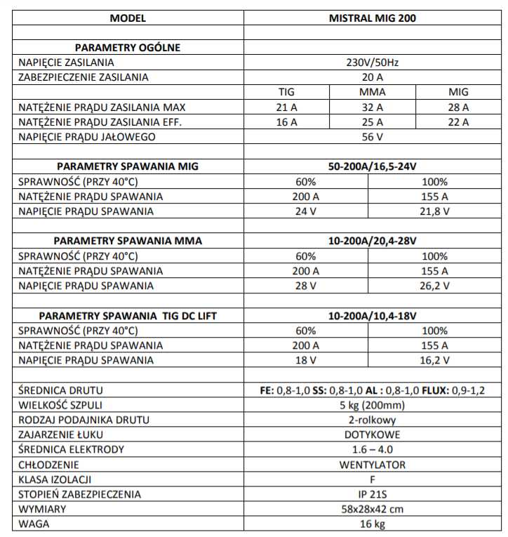 - Typ urządzenia: MISTRAL MIG 200