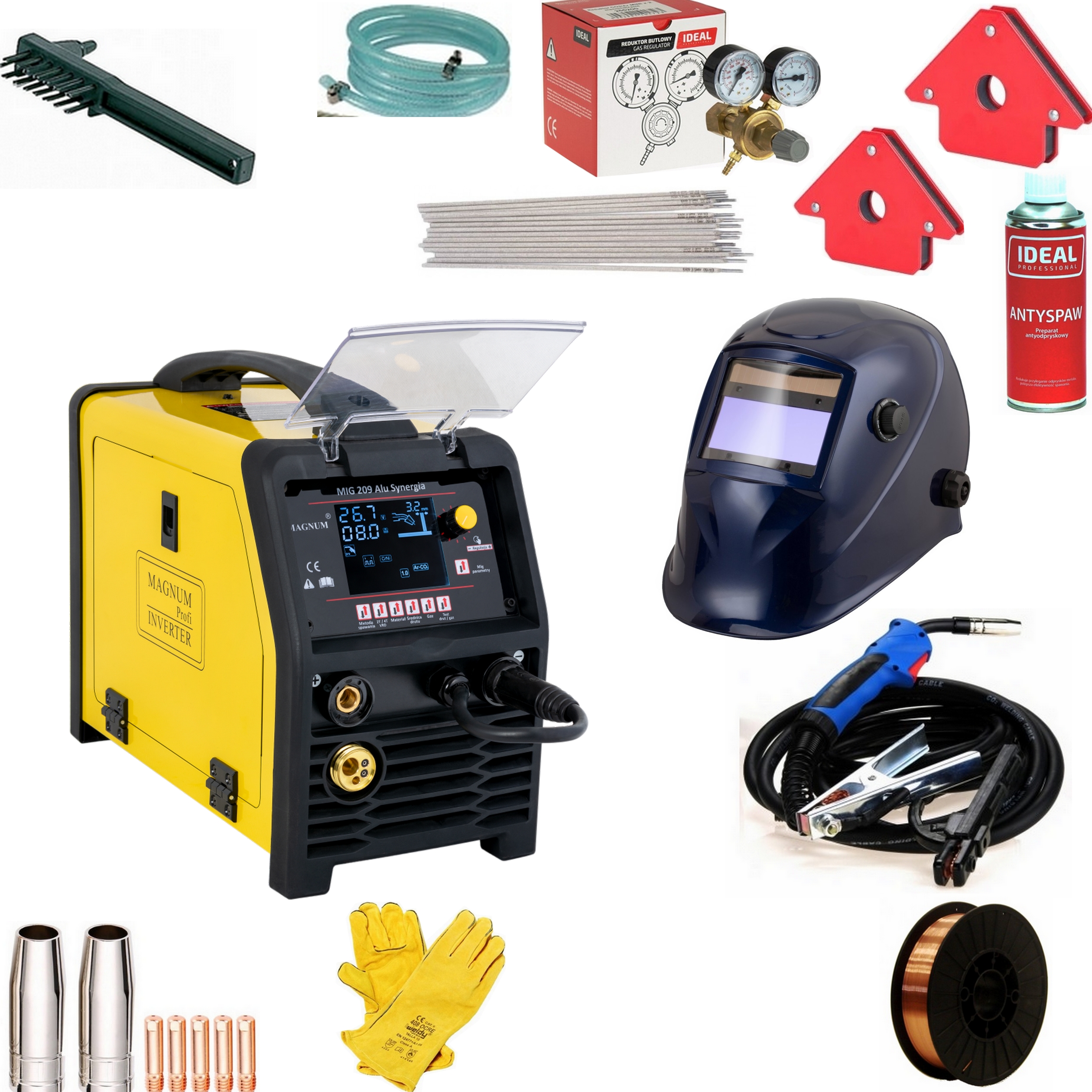 Urządzenie MAGNUM MIG 209 Alu Synergia jest profesjonalnym, synergicznym półautomatem spawalniczym, przeznaczonym do ręcznego, elektrycznego spawania stali niskowęglowej, niskostopowej (MAG), stali stopowych oraz aluminium i jego stopów (MIG).