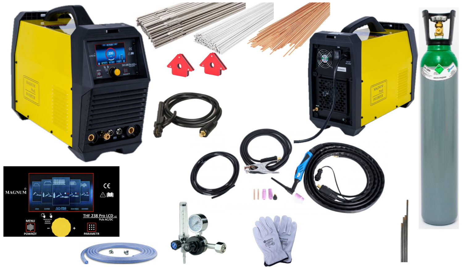 Urządzenie THF238 PRO V2 AC/DC marki MAGNUM jest profesjonalną, lekką spawarką inwertorową przeznaczoną do spawania metodą TIG HF (z bezstykowym zajarzaniem łuku spawalniczego) prądem przemiennym AC oraz stałym DC. THF 238 zapewnia doskonałą wydajność w spawaniu aluminium i jego stopów, stali niestopowej, niskostopowej, wysokostopowej, tytanu oraz innych spawalnych metali i stopów. Urządzeniem można również spawać metodą MMA z wykorzystaniem topliwych elektrod otulonych.