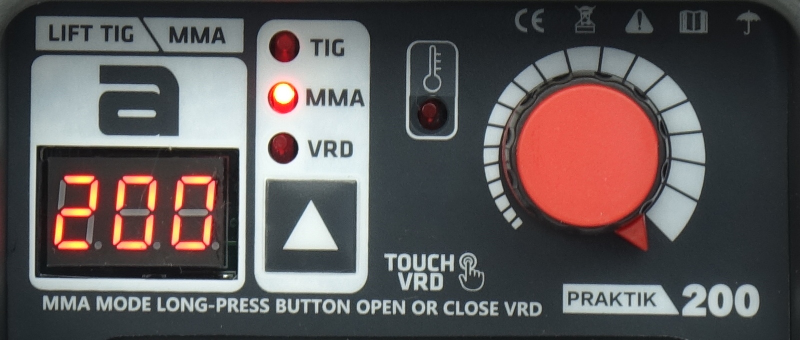 Funkcja VRD (Voltage Reduction Device) - redukuje napięcie spoczynkowe stanu jałowego na elektrodzie do wartości bezpiecznej. Zapewnia bezpieczeństwo przeciwporażeniowe podczas pracy w wilgotnym środowisku.